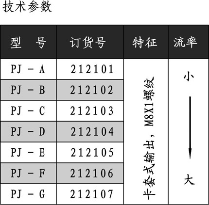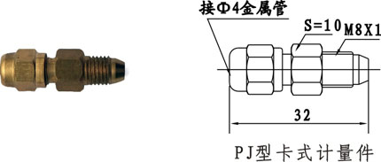 "P"系列抵抗式分配器又稱抵抗式計量件。為管式結(jié)構(gòu),輸出口接外徑Φ4油管,有卡套式和擴口式兩種形式。它由單向閥和節(jié)流元件等組成。分配油量多少決定于計量件的流率及計量件兩端的壓力差。因此它能將油泵提供一定量的潤滑油按比例分配到各潤滑點。既可間歇工作,又可用于連續(xù)供油。計量精度低于容積式分配器。其中:PD型計量件連接螺紋為M10X1,PJ型計量件連接螺紋為M8X1。適用油液范圍:N22#-N68#潤滑油。
