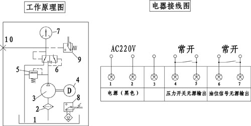 “CP”電動泵工作原理:電機4得電,驅(qū)動齒輪泵3運轉(zhuǎn).通過吸油濾網(wǎng)2從油箱1吸入潤滑油,經(jīng)自動換向閥6壓送至輸出口10輸往系統(tǒng)。電機失電,停止泵油。換向閥6在差壓信號的作用下恢復(fù)至左位機能,溝通主管路卸荷通道。系統(tǒng)壓力經(jīng)自動換向閥6快速卸荷到油箱.系統(tǒng)壓力由調(diào)壓閥5控制,壓力表7顯示。油位開關(guān)8和壓力開關(guān)9作為選配件。
