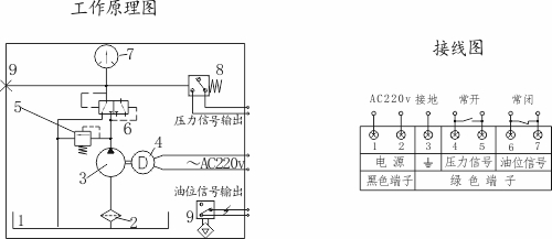 三、電氣接線說(shuō)明 1、經(jīng)主機(jī)控制的AC220V電源接到油泵的黑色端子上; 2、綠色端子上的常開(kāi)型壓力信號(hào)和常閉型油位信號(hào)輸出端接到主機(jī)控制器的信號(hào)輸入端; 3、接地線可靠連接。 四、使用與調(diào)整 1.參考“電氣接線說(shuō)明”連接。只要接通電源,"電源燈"亮;油泵處于泵油狀態(tài),對(duì)外輸出液壓能。油泵失電,"電源燈"滅;油泵處于停泵狀態(tài)。 2.潤(rùn)滑泵適用環(huán)境溫度:-10°C~ 50°C; 3.每次應(yīng)添加清潔的潤(rùn)滑油,加油時(shí)翻開(kāi)加油蓋,經(jīng)加油濾網(wǎng)注入,加入量應(yīng)在油箱的油位線范圍內(nèi)。每半年須清洗一次油箱,同時(shí)清洗或更換加油濾網(wǎng)和油泵吸油濾網(wǎng)。 4.油泵應(yīng)水平安裝,應(yīng)盡量避免在有腐蝕性氣體、塵埃和高濕環(huán)境下使用。 5.接通電源后,不允許打開(kāi)罩蓋,以防發(fā)生電擊危險(xiǎn)。 6.“CP”型電動(dòng)泵面板設(shè)有工作指示燈,得電時(shí)泵油,指示燈亮,油泵工作,輸出潤(rùn)滑油。失電時(shí)油泵停止工作,指示燈滅,系統(tǒng)壓力自動(dòng)卸荷。工況由外來(lái)信號(hào)控制。 7.系統(tǒng)壓力由調(diào)壓閥控制。順時(shí)針旋擰壓力閥調(diào)接螺釘,壓力升高;反之,壓力降低。出廠時(shí)均已調(diào)好(2.5 MPa)且鎖緊。用戶一般不要隨意調(diào)節(jié)。