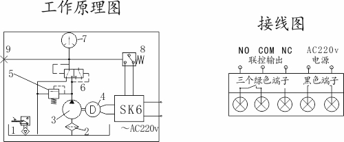 二、工作原理 “GP468”智能泵工作原理:將間歇時間設(shè)定后,即進(jìn)入間歇計時狀態(tài),中途斷電再次通電后繼續(xù)遞減計時,累計計滿預(yù)設(shè)的間歇時間!癝K6”型控制器確認(rèn)常開型壓力開關(guān) 8復(fù)位的前提下(斷態(tài)信號,通態(tài)報警),控制電機(jī)4運(yùn)轉(zhuǎn)驅(qū)動齒輪泵3泵油,經(jīng)自動換向閥6壓送至輸出口9輸往潤滑系統(tǒng)。當(dāng)系統(tǒng)分油結(jié)束,壓力上升到壓力開關(guān)動作壓力時,“SK6”型控制器指令油泵電機(jī)繼續(xù)運(yùn)轉(zhuǎn)10秒鐘(這是保壓時間,可調(diào))。期間系統(tǒng)壓力穩(wěn)定到溢流閥5的調(diào)定壓力(保壓)。停泵時,換向閥6在差壓信號的作用下恢復(fù)至左位機(jī)能,溝通主管路卸荷通道。系統(tǒng)壓力卸壓。油箱油位下降到下限位置時,油位開關(guān)1發(fā)通態(tài)信號。額定壓力由調(diào)壓閥5控制,壓力表7顯示。