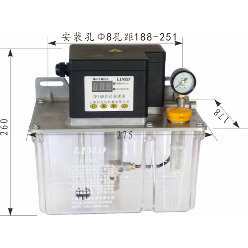 一、概述 “GP468”智能潤滑泵,內(nèi)含“SK6”型控制器、自動卸荷閥、自動排氣內(nèi)閥、溢流閥、低油位報警、壓力開關(guān)等,其中壓力開關(guān)使用壽命高達(dá)100萬次,屬間歇工作泵。用于需周期工作的容積式定量集中潤滑系統(tǒng)。泵油間歇時間設(shè)置范圍:1~999分鐘(倒計時),具有斷電記憶功能;每次泵油時間長短根據(jù)環(huán)境溫度變化、負(fù)載多少自動調(diào)整;油泵的運(yùn)行時間和間歇時間均采用數(shù)碼管顯示。 工作電源:AC220v,50/60(Hz); 功率:60(w);額定壓力:2.5(MPa);額定流量:160(ml/mim); 油箱容量:4升;適用介質(zhì):N32#~N320#潤滑油。