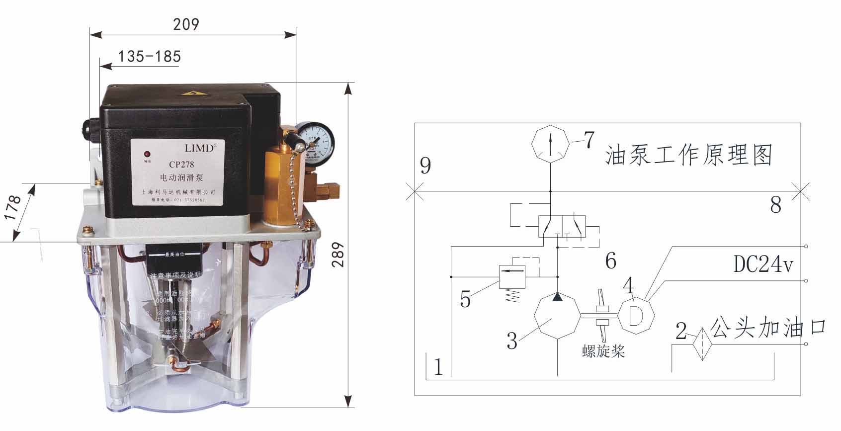 CP278型電動油脂泵是一種電機驅(qū)動齒輪泵,屬于順置式結(jié)構(gòu):電機設(shè)在上方,油箱及泵芯設(shè)在下方。內(nèi)含自動卸荷閥、調(diào)壓閥、攪拌及壓送油脂的螺旋槳等,屬間歇工作泵。用于需周期工作的容積式定量集中潤滑系統(tǒng)。電動泵的工況受外來指令控制,得電泵油,失電停泵及自動卸壓。 電源電壓:DC24v,額定功率≤120w;額定壓力5.0MPa;額定流量120ml/min。適用潤滑介質(zhì):000#、00#、0#油脂。 “CP278”電動泵工作原理:電機采用雙動力輸出,外圈低速旋轉(zhuǎn)驅(qū)動螺旋槳及攪拌棒,用于攪拌及壓送油脂,解決油脂凝固及起助吸作用;內(nèi)圈高速旋轉(zhuǎn)驅(qū)動泵芯泵油。 電機1得電,內(nèi)圈高速動力驅(qū)動泵芯3運轉(zhuǎn),從油箱1吸入油脂,泵出高壓油源。再經(jīng)自動換向閥6壓送至輸出口8和9輸往系統(tǒng)。電機失電,停止泵油。自動換向閥6在差壓信號的作用下恢復至左位機能,溝通主管路卸荷通道。系統(tǒng)壓力由調(diào)壓閥5控制,壓力表7顯示。